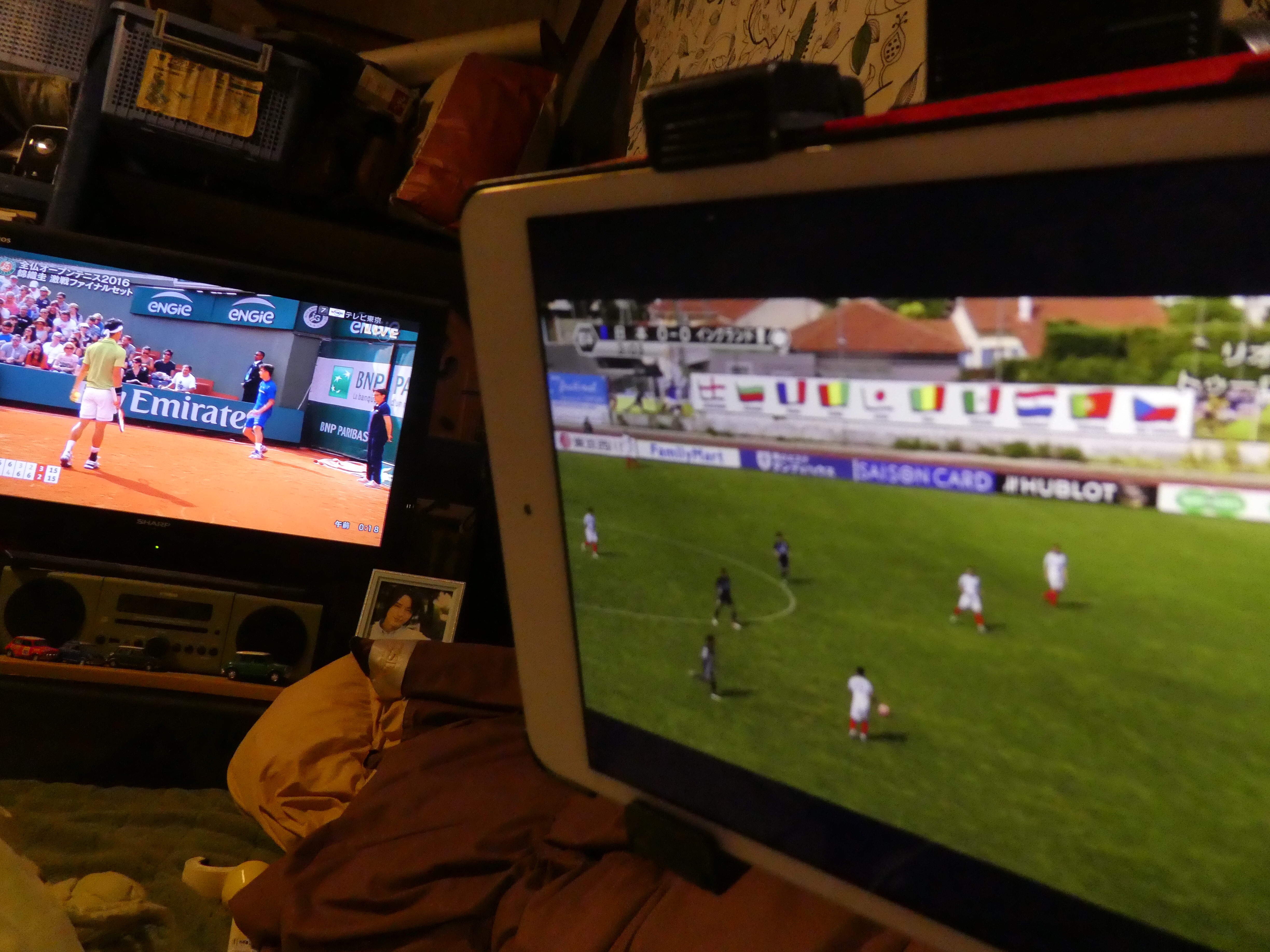 右はアイパッド左はテレビという布陣で臨む!笑
