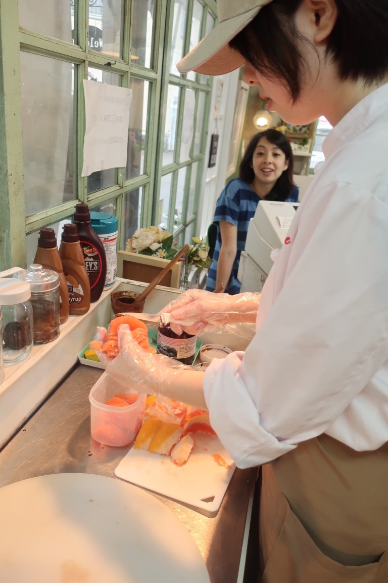 新鮮なグレープフルーツの皮むきに目を丸くするお客様!