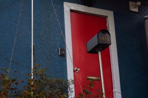 夕日が当たる赤いドアー
