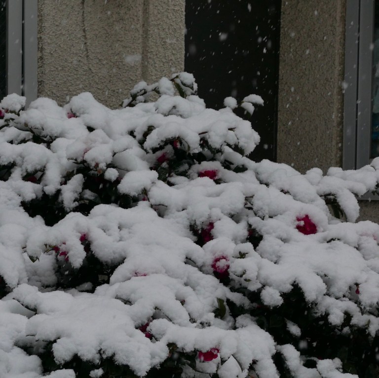 椿の花が雪に潰されそう