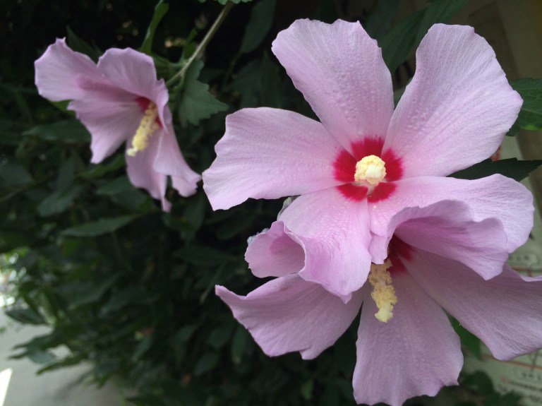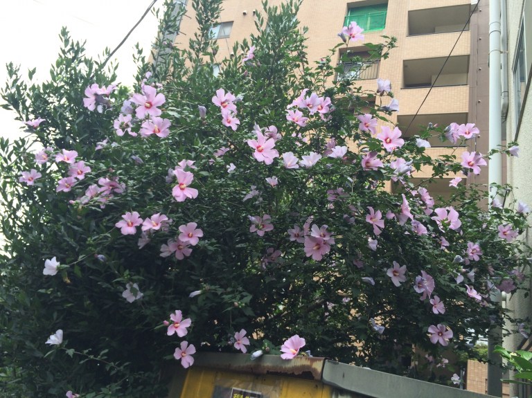 冷房を効かせたお店から見える芙蓉の花