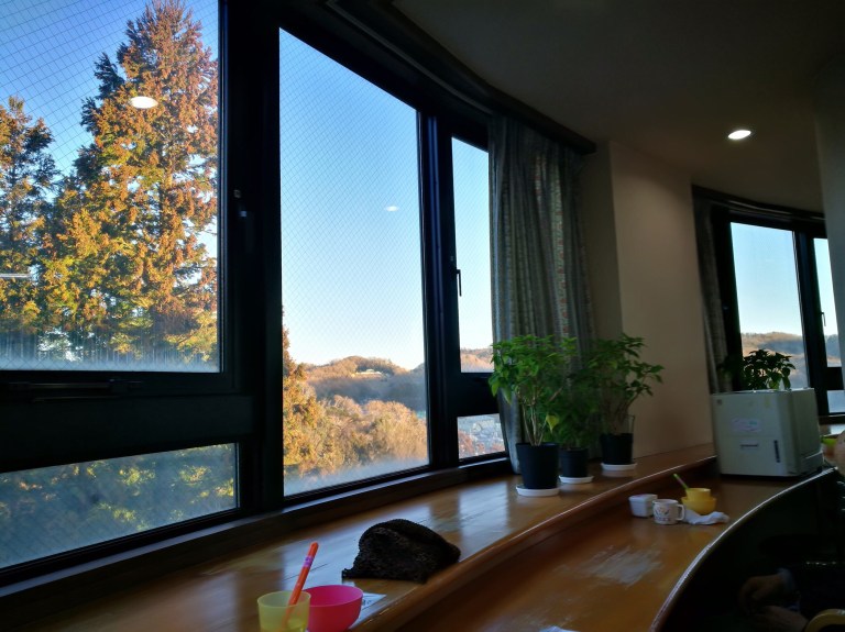 朝日の当たるラウンジから山並みが見える