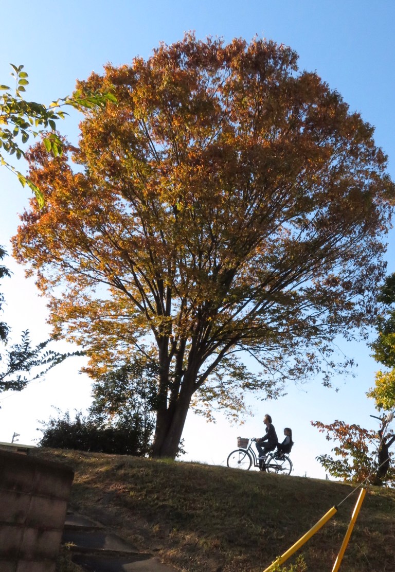 自転車に乗った親子がシルエットになって