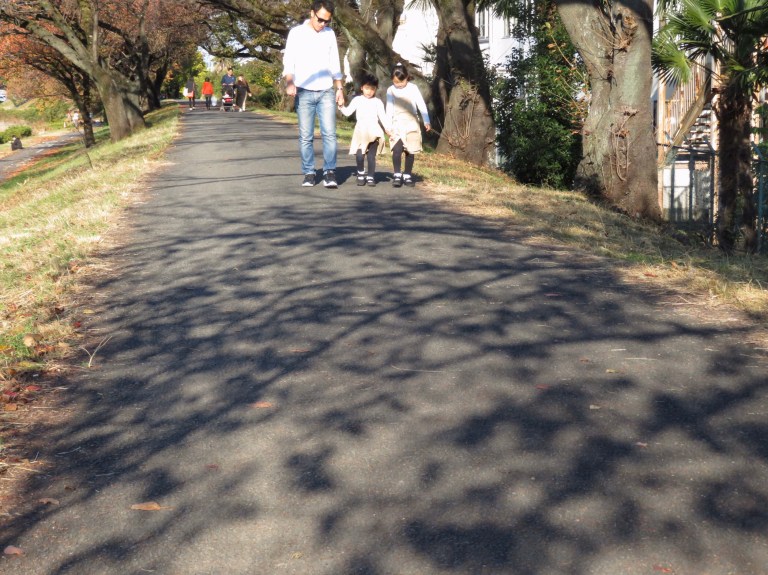 並木通りを車椅子で散策しながら
