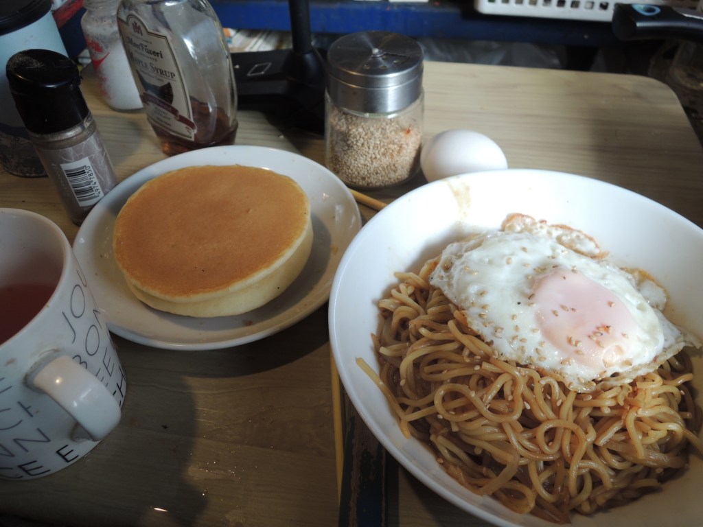 今日は豪華にパンケーキに焼きそばを作って